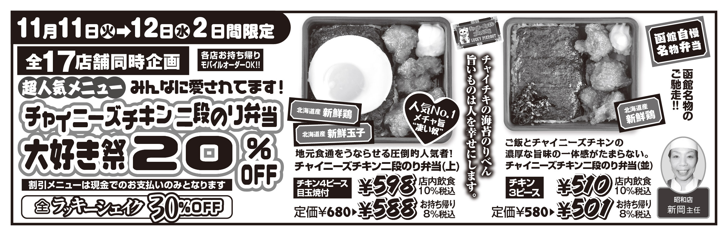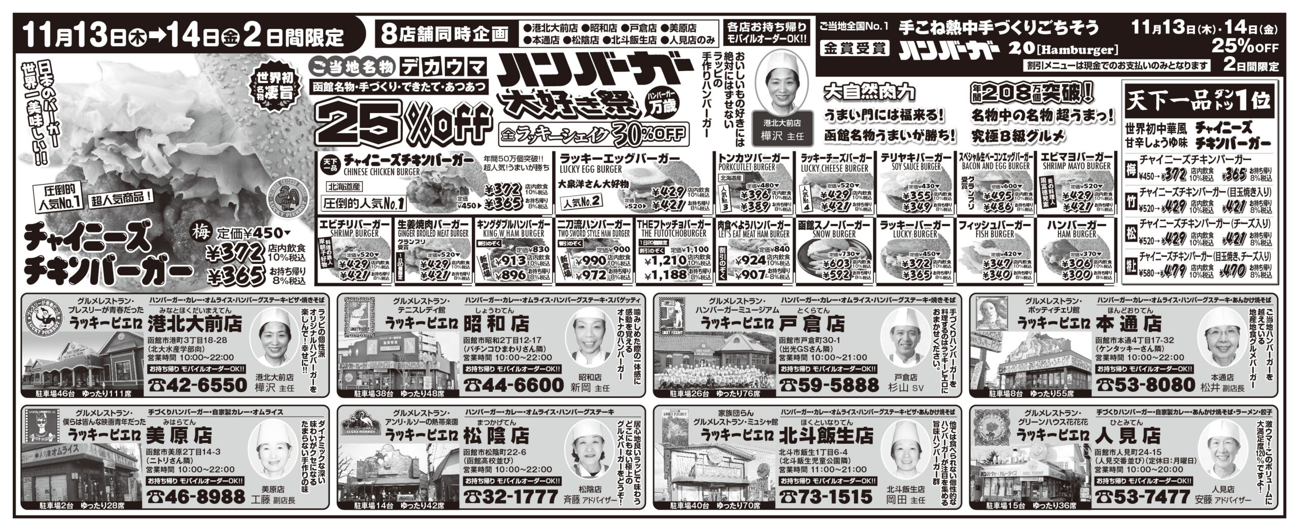 | 毎週金曜日 | 生ビール ¥299 | マリーナ末広店 峠下総本店 五稜郭公園前店 函館駅前店 |