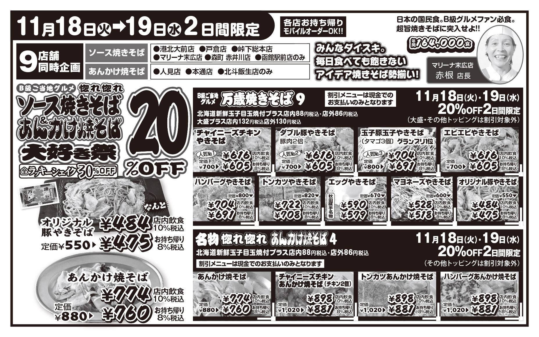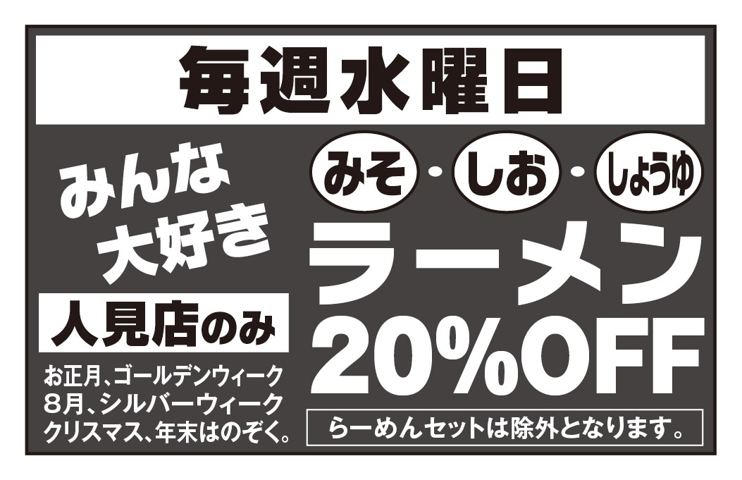 | 毎週水曜日 | 激旨ラーメン 30%OFF | 人見店のみ |